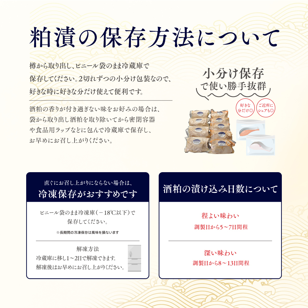 鮭と銀鱈粕漬 タル特大(小分け) 魚貝類 サーモン 漬魚 粕漬け 加工食品 看板商品 漬け込み 芳醇 香り 凝縮 旨味 食べやすい 簡単調理 便利