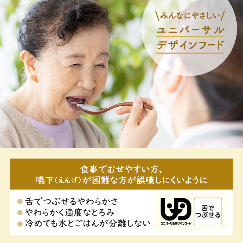 また、冷めても水とごはんが分離しないで、食事でむせやすい方にも安心です。また、のどに残りにくいのが特徴です。