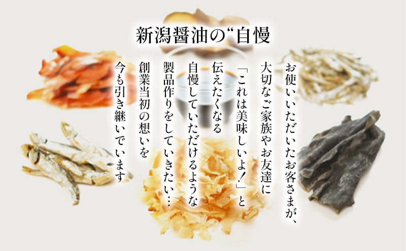新潟県内では先駆けて製造を始めて60年以上が経つロングセラー商品で「我が家の味」として親しまれ、全国にファンを持つ万能タイプの「めんつゆ(5倍濃縮)」と、鰹の厚削り節からじっくりとダシを取った醤油屋の「白だし」、刺し身や寿司に良く合う本醸造・濃口で塩分控えめの「うす塩醤油」、エキス分の多い濃厚なみりん風の発酵調味料をセットしました。