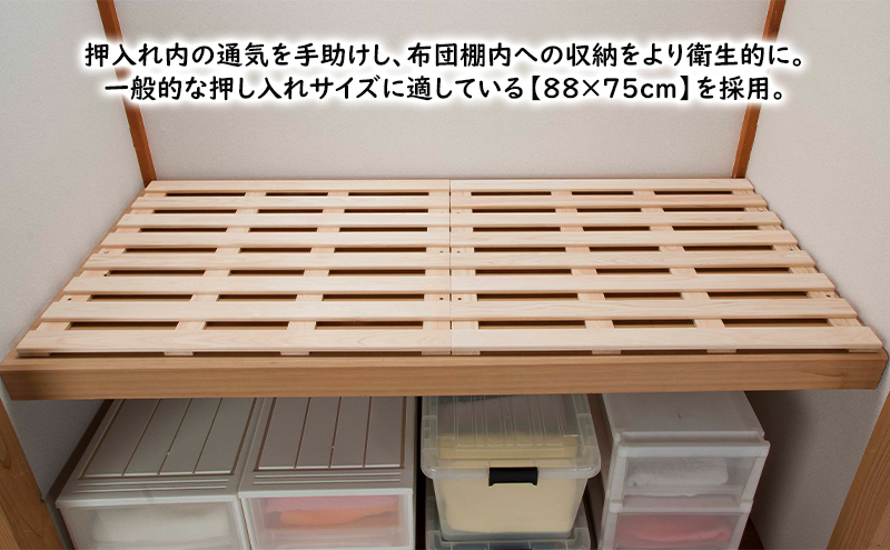 押入れ内の通気を手助けし、布団棚内への収納をより衛生的にお使いいただけます。一般的な押し入れサイズに適している【88×75cm】を採用。ひのき製なので丈夫で長くお使いいただけます。