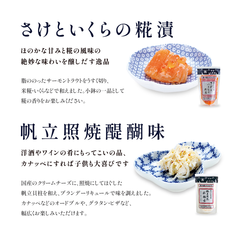 国産のクリームチーズに、照焼にしてほぐした帆立貝柱を加え、ブランデーリキュールで味を調えた「帆立照焼醍醐味」を詰合せました。