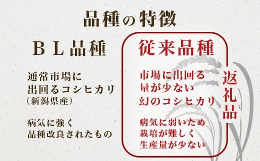 新潟県産として通常市場に出回るコシヒカリの多くは、BL品種(病気に強く品種改良されたもの)ですが、【従来品種】はコシヒカリが有名になったころに作られていたお米で、病気に弱いため栽培が難しく、生産する農家が年々減っております。ぜひ幻のコシヒカリをご賞味ください!