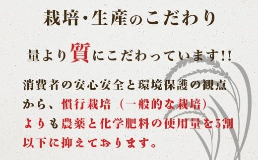 消費者の安心安全と環境保護の観点から、慣行栽培(一般的な栽培)よりも農薬と化学肥料の使用量を5割以下に抑えております。