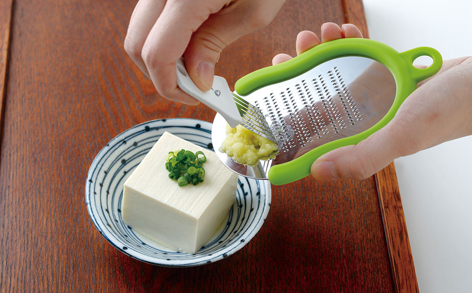おろし金を湾曲させ、食材の接地面を少なくすることで力をかけずに、楽におろすことができるおろし器に手のひらサイズの薬味おろし器をセットしました。