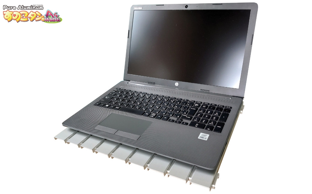 ノートPC用冷却台「ピュアアルミニウムすのこタン。A4wide」は、アルミニウムの高い熱伝導率と”すのこ”の通気性でPCを優しく冷却します。