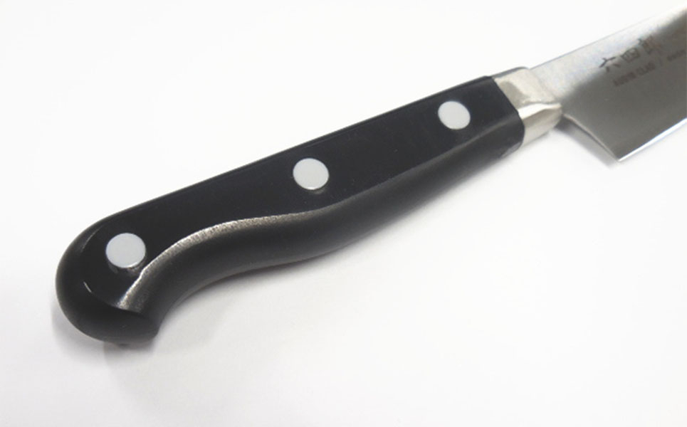 重量と重心バランスをよくすることで、刀身の重量を利用して切れ、皮むきは手首に負担がかかりにくい設計になっています。 柄元は細く、柄尻は太くなっており握りやすく力が伝えやすい形状です。