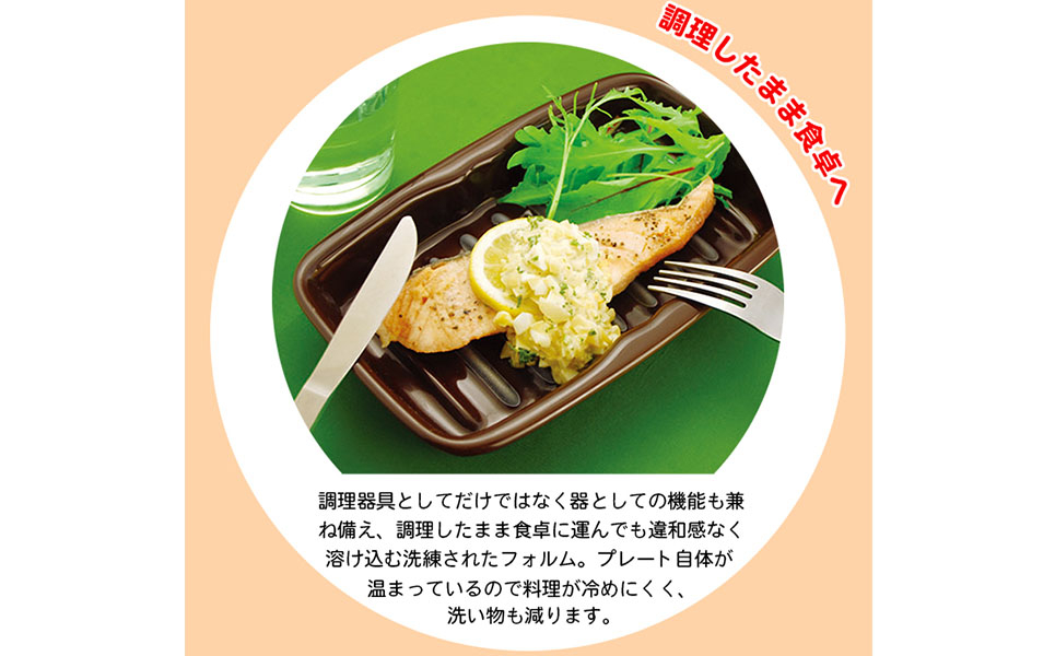 食材をプレートにのせて、電子レンジでチンするだけで、簡単に時短・焼き調理がおこなえます。