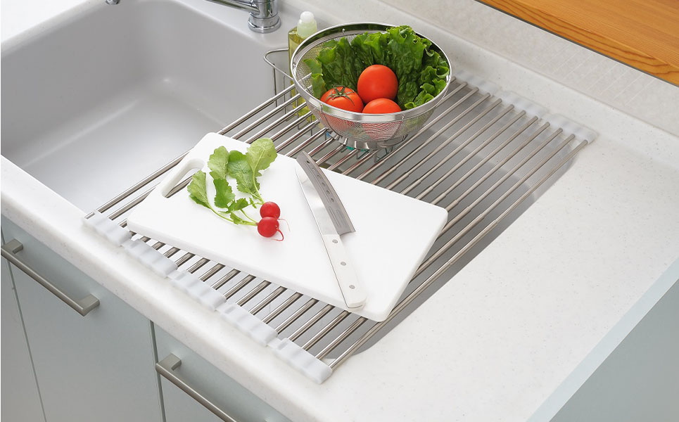 コンパクトにたためて収納でき、使う分だけ広げて使える便利な水切りです。