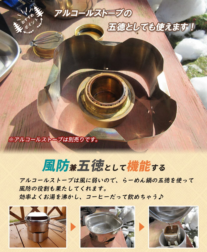 市販の固形燃料(ソリッドヒューエル)やアルコールバーナーで手軽にインスタントラーメンやレトルト食品の調理、カップ麺やコーヒーの湯沸かしなど手軽に楽しむことができます。