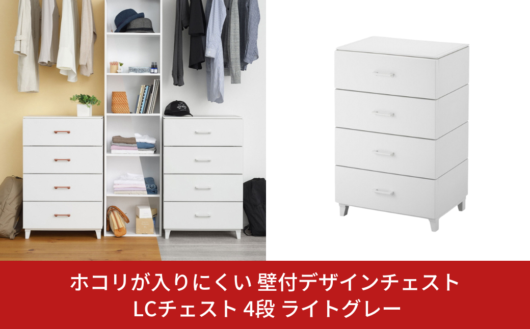 チョイスPayポイントと交換できる品 ホコリが入りにくく大切な衣類を守ります ホコリが入りにくい 壁付デザインチェスト LCチェスト 幅56cm 4段 ライトグレー 組立式 燕三条製 収納棚 キャビネット 収納ボックス 衣類収納 衣装ケース 引出し収納 ルームチェスト 新生活 一人暮らし 【019S011】