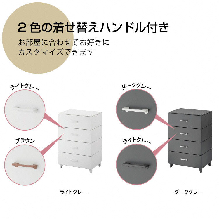 インテリアに合わせて付け替え可能なハンドルが2種類付属しています。 本体はスッキリした佇まいのデザインで、お部屋に馴染みます。