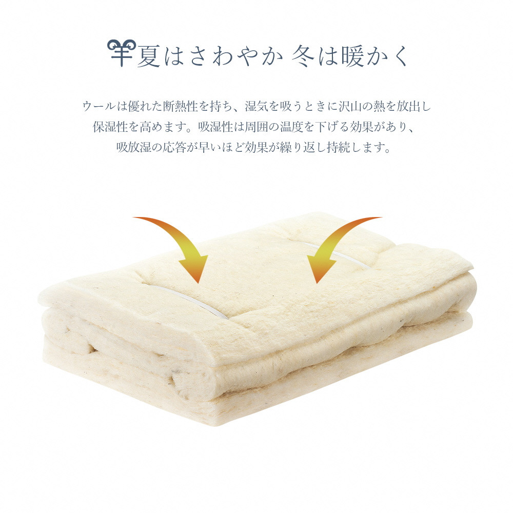 羊まくらの芯材であるウールには優れた吸放湿性があり、湿度を含むと繊維が開き、乾くと閉じる性質を持っています。