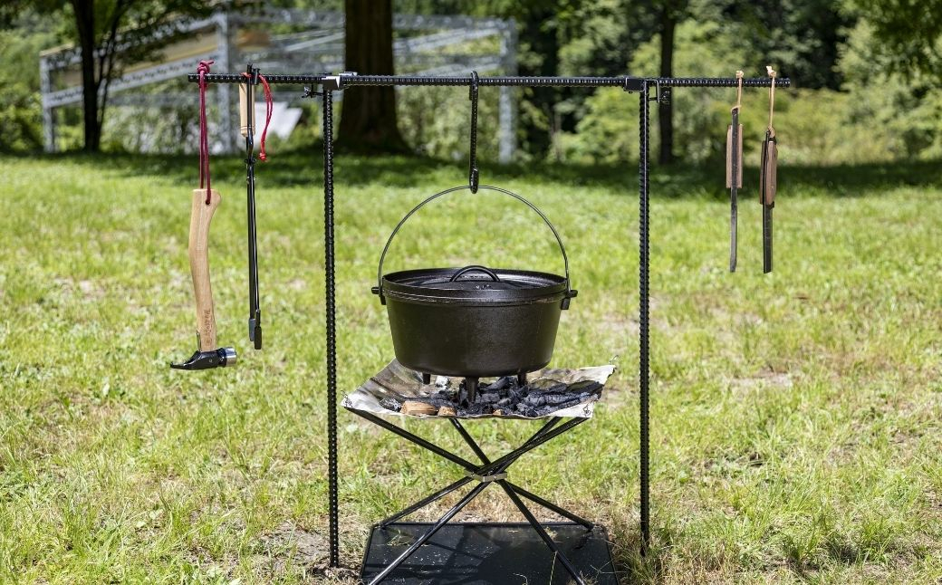 用途に合わせて、無骨なデザインの焚火用調理スタンド