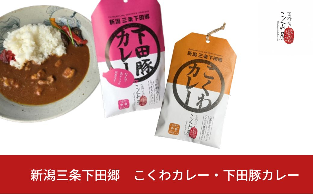新潟県三条市の奥地「下田郷」で古くから自生するキウイフルーツの原種果実「こくわ」と六種の野菜を使用したフルーティーで甘みと爽やかな口当たりの「こくわカレー」 と、こくわカレーをベースに自然豊かな下田郷で育てられたとても美味しいと評判の下田豚をゴロッと入れた「下田豚カレー」です。