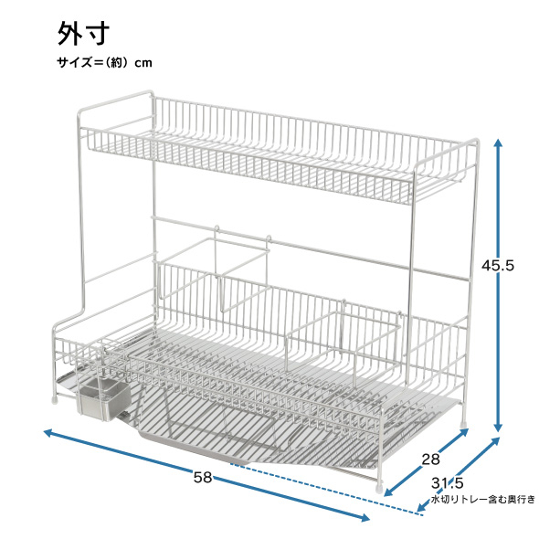| 容量 | ●サイズ・重量:約幅58×奥行28(トレー含む奥行 31.5)×高さ45.5cm 約4.3kg ●材質:本体・カトラリーケース・仕切り/18-8ステンレス 水切りトレー/18-0ステンレス 脚キャップ/シリコンゴム ●耐荷重:30㎏/上段10kg・下段20kg ●その他:完成品(トレー・仕切り取り付け) ●付属品:仕切り2個、カトラリーケース付き |