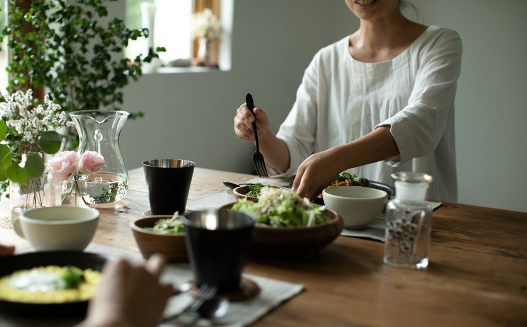 ライフスタイルブランド『96(KURO)』では、カトラリーやカップ、アウトドア用品の焚火台やナタなど、暮らしに溶け込む製品を展開しています。使い手によって風合いが変化するのも大きな魅力。日々の食卓で使う中で、油や酸、触れる頻度によって黒の表情が徐々に深まります。人それぞれの手に馴染み、まるで革製品を育てるように、自分だけの味わいを楽しめます。