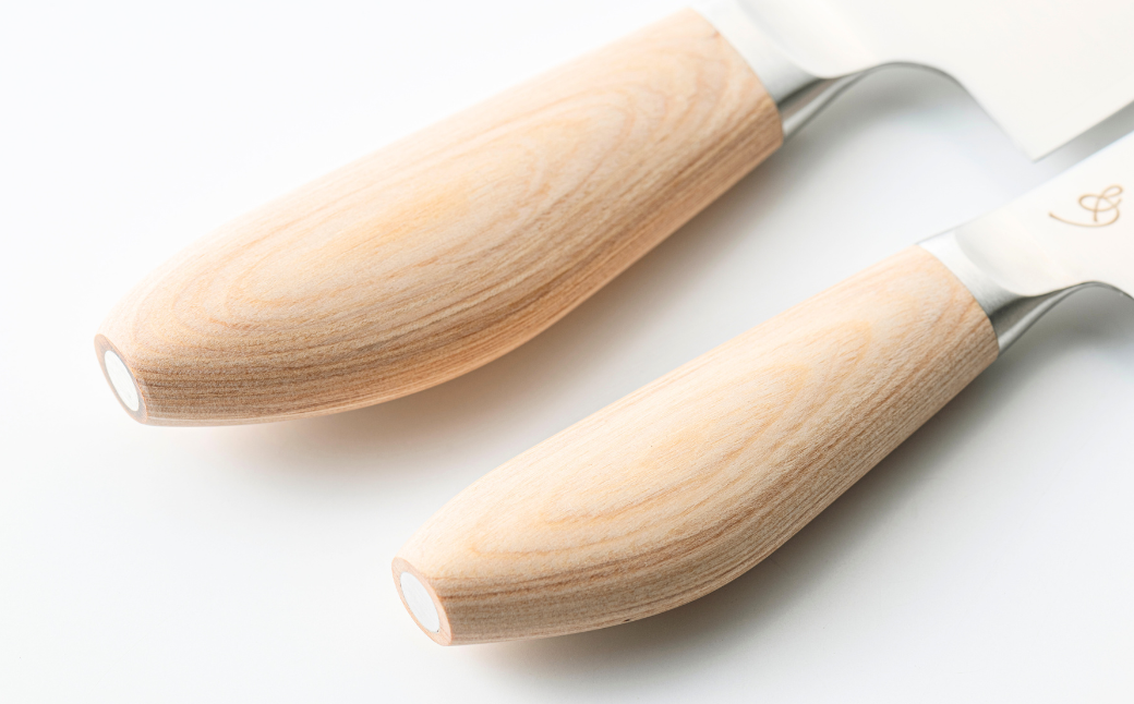 防水力のある天然木を、ハンドルに使った万能包丁とペティナイフのセットです。