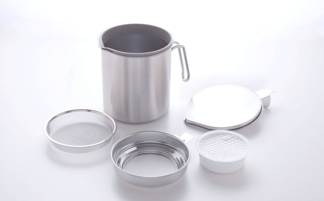 | 容量 | 容器本体×1個、蓋×1個、網皿×1枚、ろ過機×1個、活性炭カートリッジ×1個 サイズ:本体/内径(約)12.5×深さ(約)14.5cm・全長(約)19(cm)全幅(約)14.5(cm)、網皿・ろ過機・蓋/全高(約)15(cm) 底の厚さ:0.4mm、活性炭カートリッジ/径(約)9×高さ(約)3(cm)・容器本体適正容量 0.9ℓ ろ過器満水容量0.3ℓ 材 質:容器本体/ステンレス鋼・66ナイロン(耐熱温度180度)、網皿・ろ過器・蓋/ステンレス鋼、活性炭カートリッジ/木質系活性炭(食品添加物活性炭規格試験済)・布/不織布(レーヨン) 総重量:470g |