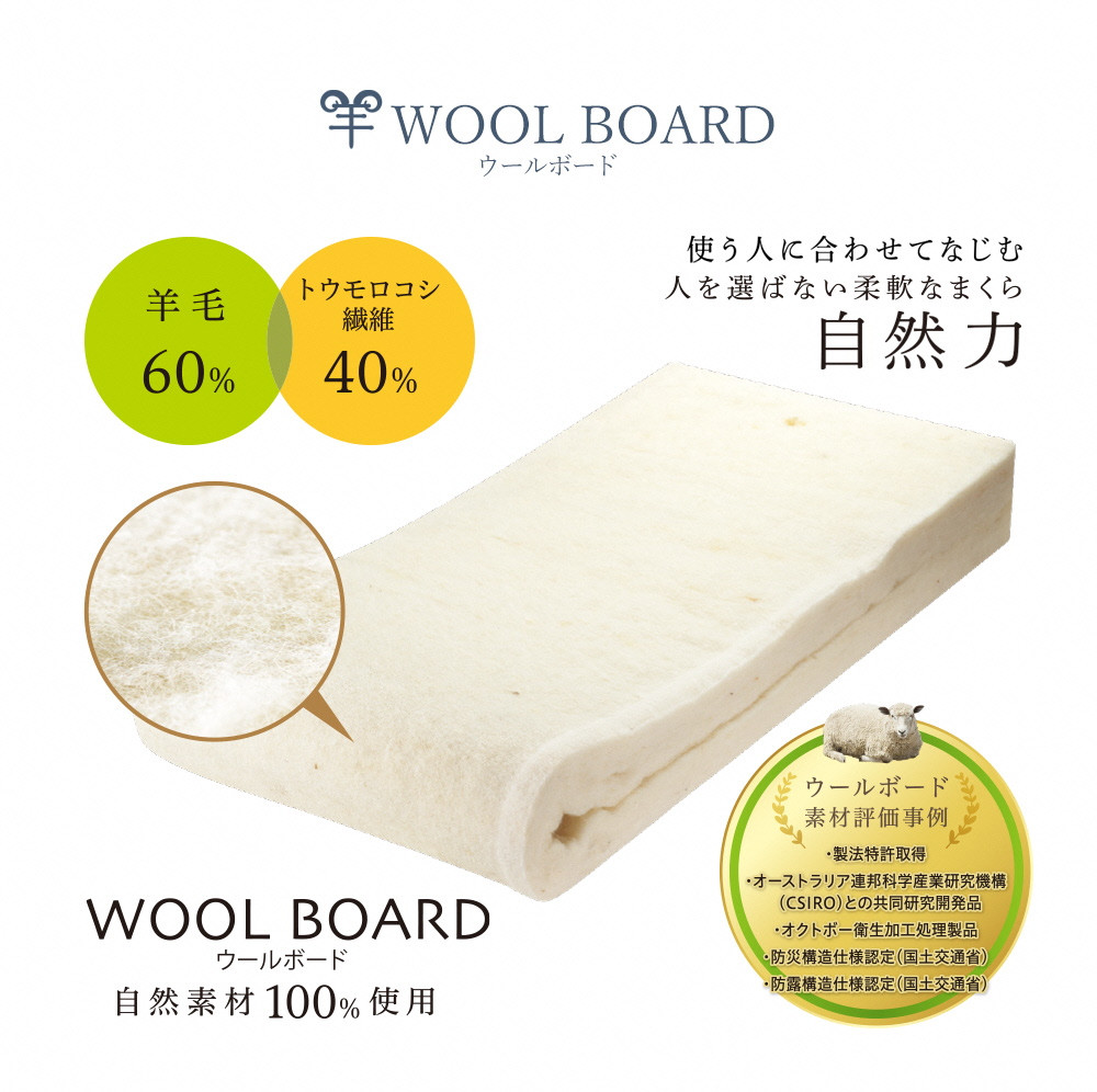 一番、体積のある枕の芯材はニュージーランド製でロムニー種の羊から刈り取られた羊毛60%と弾力強度を増すためにトウモロコシ繊維40%で混紡された20年前から取り扱い販売を行っている夏・冬兼用の建築用自然断熱材ウールボードです。