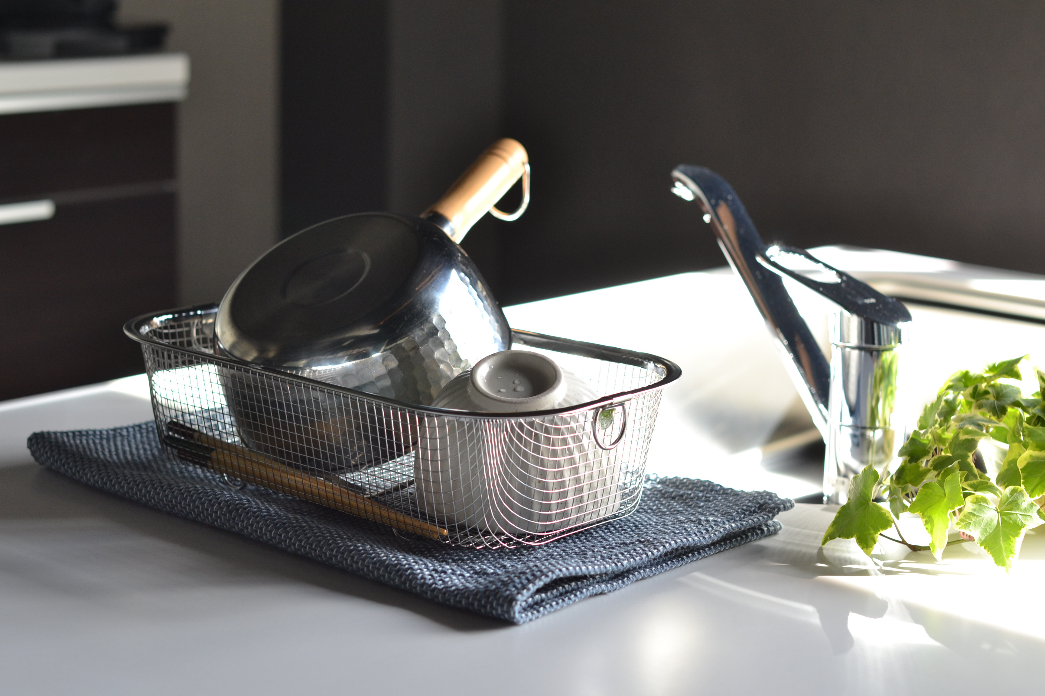 シンク周りがすっきり!片付けられるコンパクトな水切りカゴ。シンプル&コンパクトな作りで、必要な時だけサッと取り出して使えます。