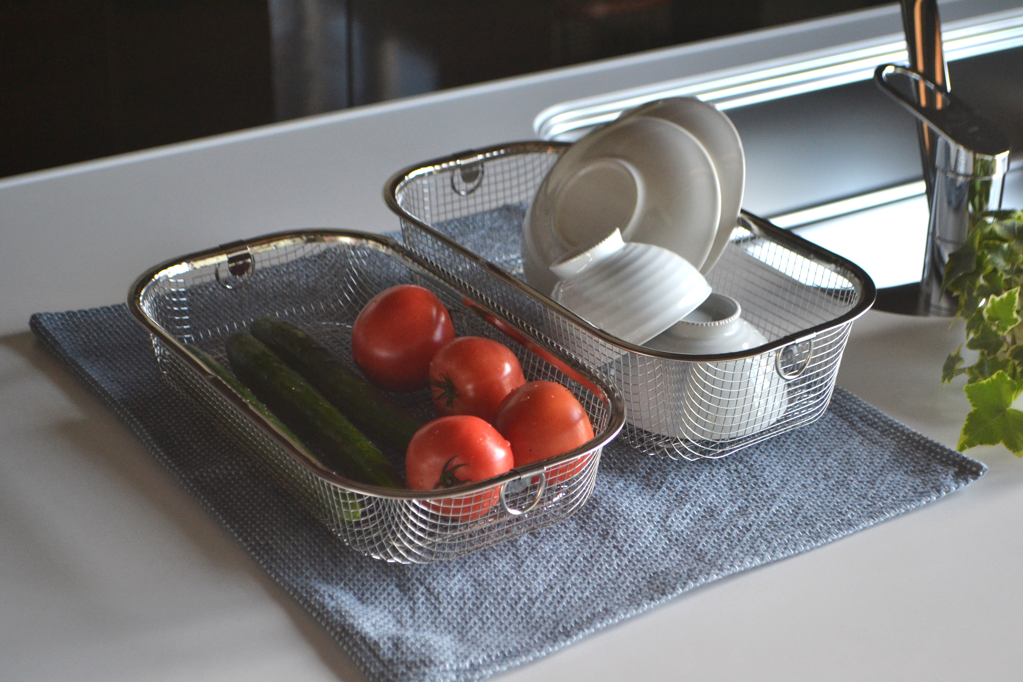 カゴの目が細かいので、お皿や小物などはもちろん、小さめの鍋などの水切りも可能。また、野菜などの水切りザルとしても便利。場所を選ばずに使えます。