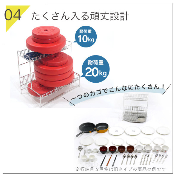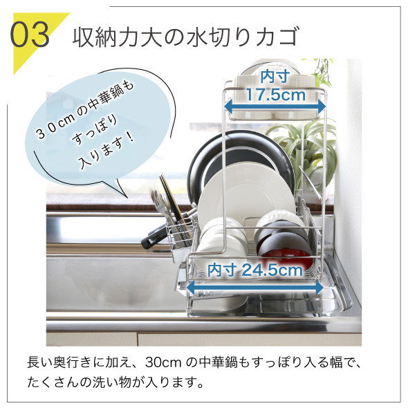 | 容量 | [サイズ]約幅43×奥行28(トレー含む奥行31.5)×高さ45.5cm [重 量]約3.3kg [材 質]本体・カトラリーケース・仕切り/18-8ステンレス 水切りトレー/18-0ステンレス 脚キャップ/シリコンゴム [耐荷重]30kg/上段10kg・下段20kg [付属品]仕切り、カトラリーケース付き [その他]完成品(トレー・仕切り取り付け) |