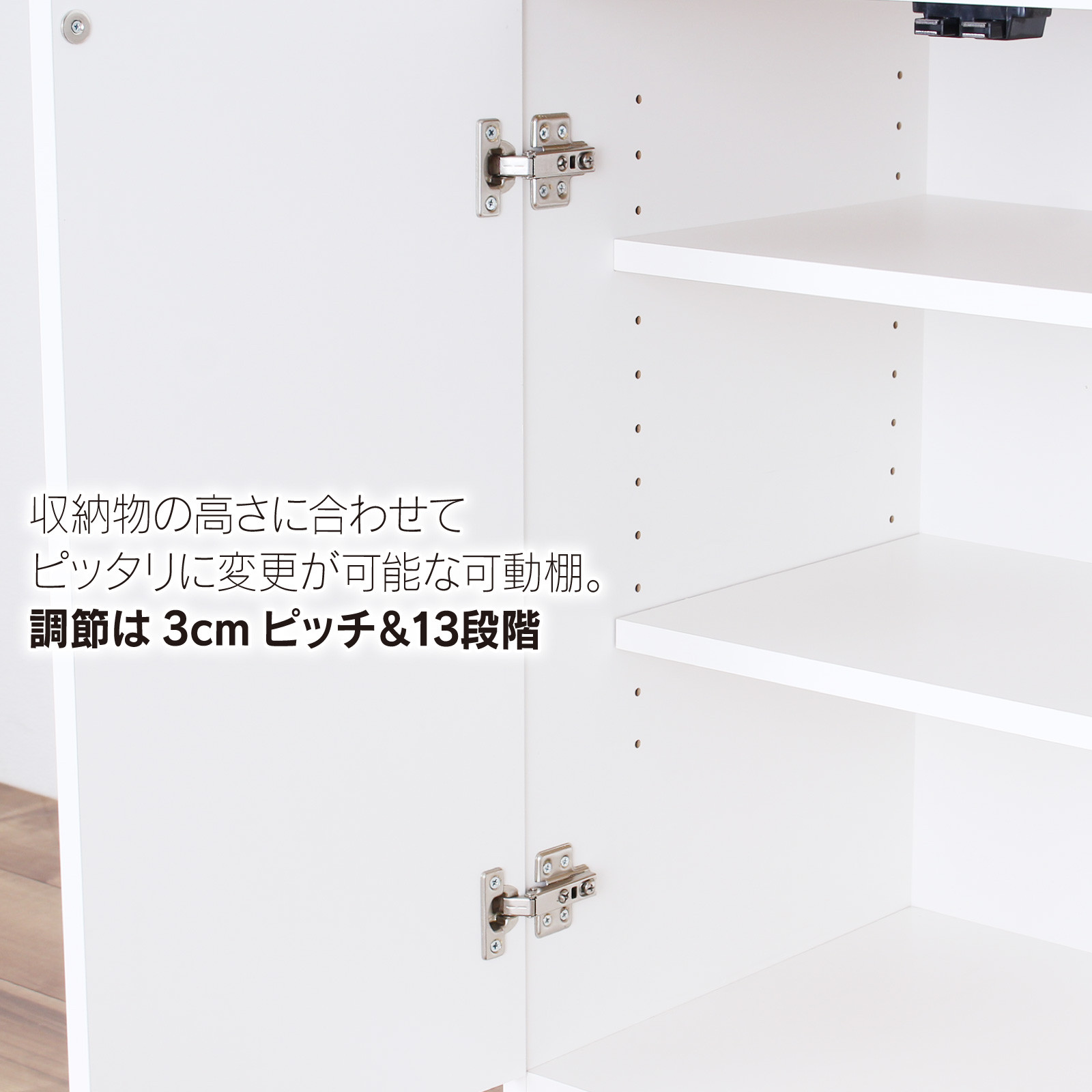 天板の背面側には家電のコードをさりげなく逃がすスリットを設け、側板は壁面にぴったり設置できる巾木よけ付き。