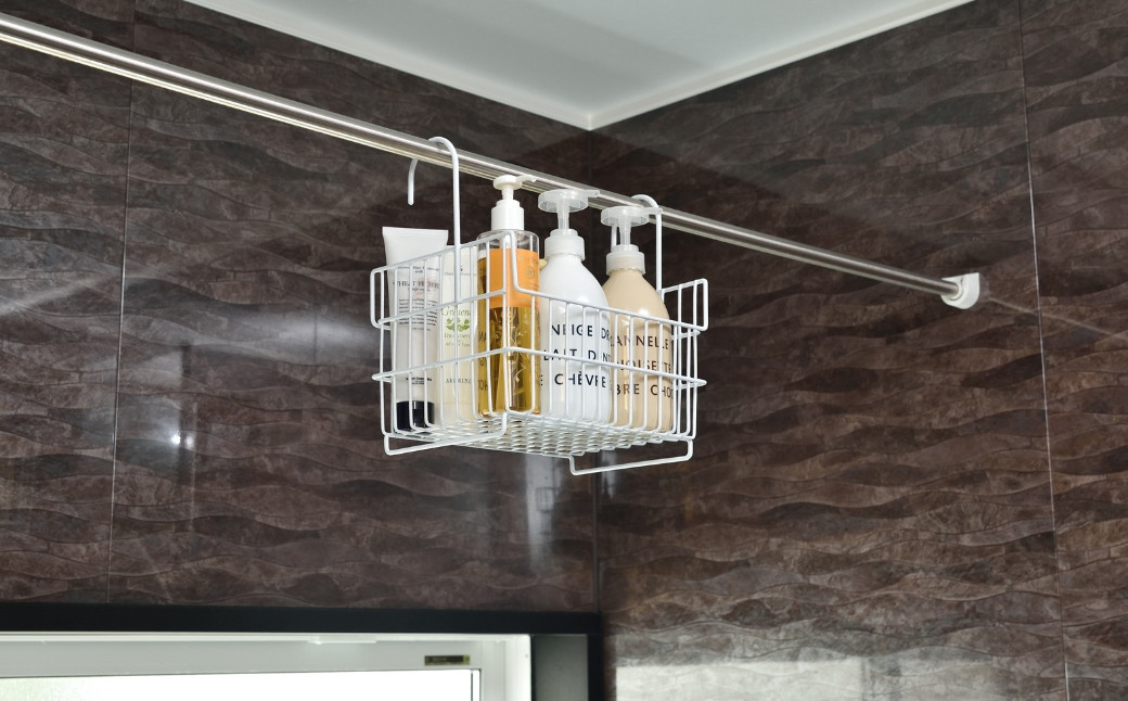 お風呂グッズをすっきり収納。 引っ掛けて乾かせるので衛生的。 燕三条の職人技。