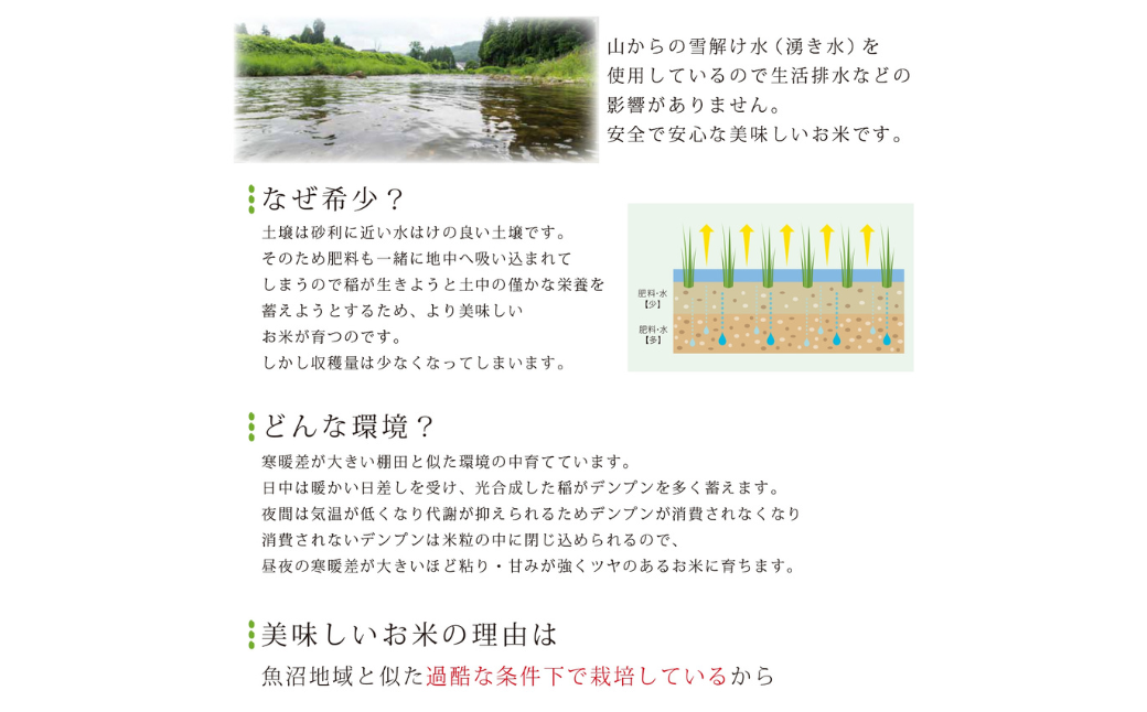 天水田で栽培しており、水源に山からの雪解け湧き水のみを利用しています。