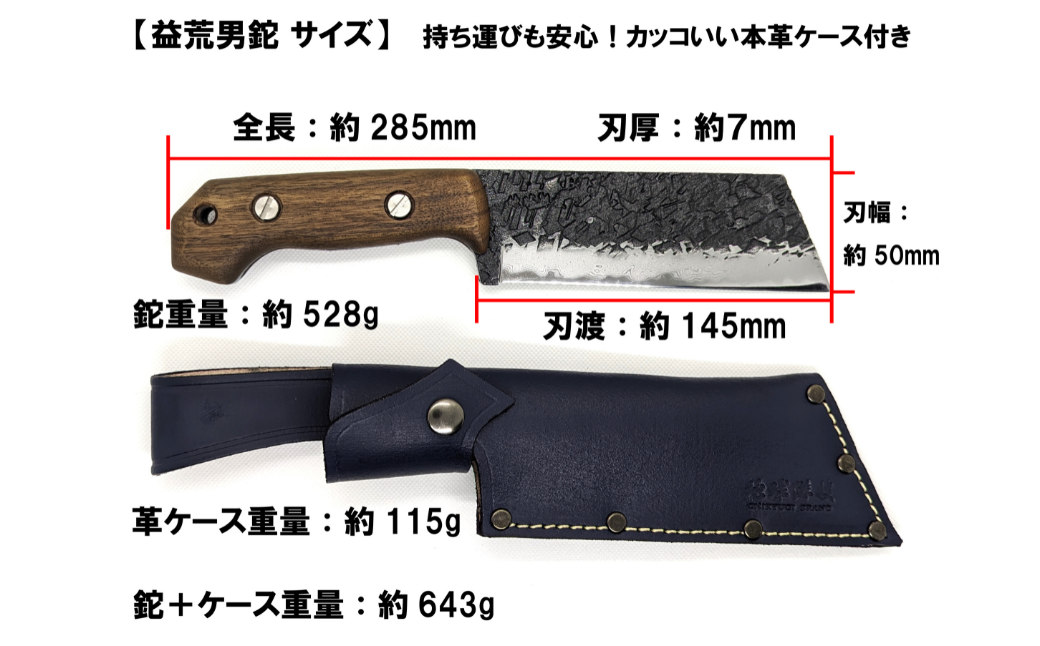 ・ナイフのような切れ味と取り回しの良さ、鉈のような力強さと頑丈さを両立した益荒男鉈です。