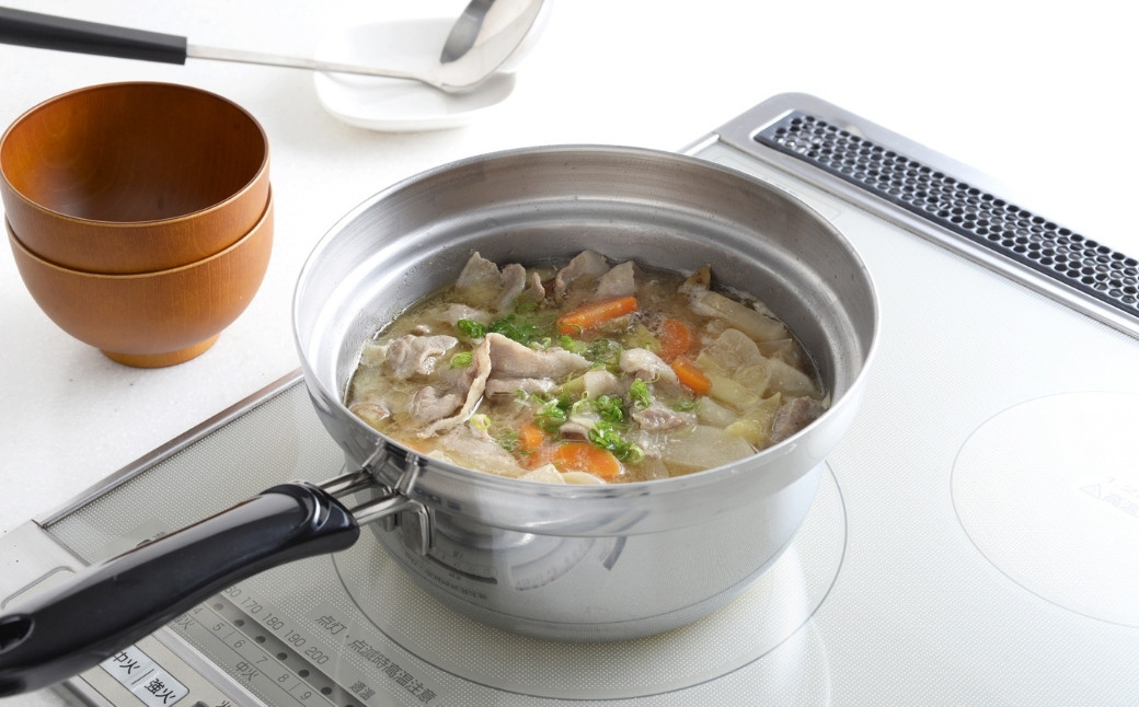 ②フチが一段高くなっているため、沸騰する時に発生した泡がフチにあたり蒸発し、ふきこぼれをガードします。「茹でる」も「煮る」も美味しく出来ます。