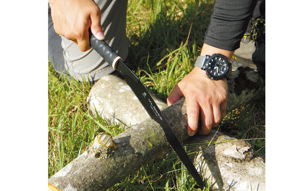 一般的なノコギリよりも刃の角度をつけてあり、力が入りやすく目線より高い木でも楽に作業できます。