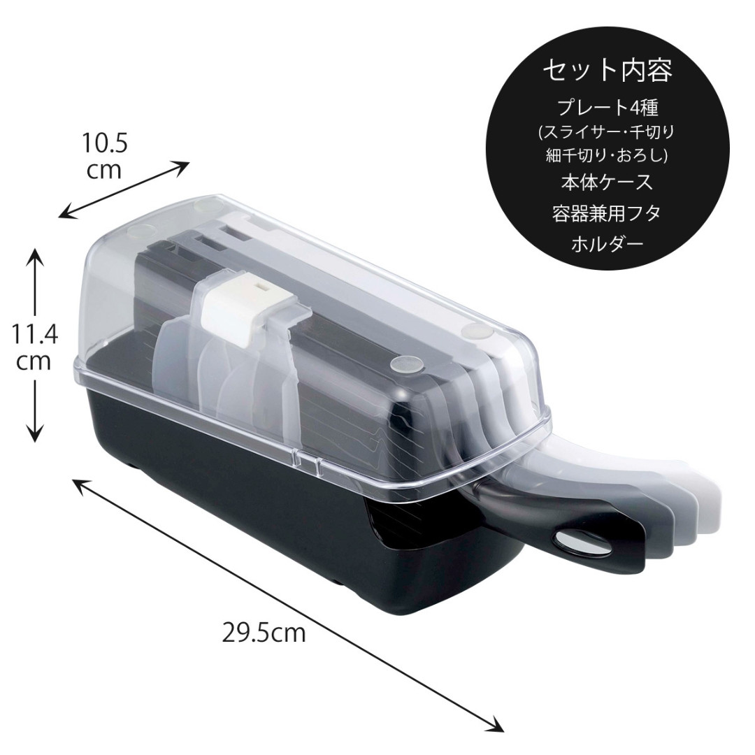 | 容量 | [サイズ(約)] 収納時:幅29.5×奥行10.5×高さ11.4 [重量] 610g [材質] 金属部:ステンレス鋼、スライス刃:ステンレス刃物鋼、蓋:AS樹脂、ホルダー:ポリプロピレン、その他:ABS樹脂・ポリプロピレン、脚ゴム:CBRゴム [その他] 食器洗い・乾燥機不可 |