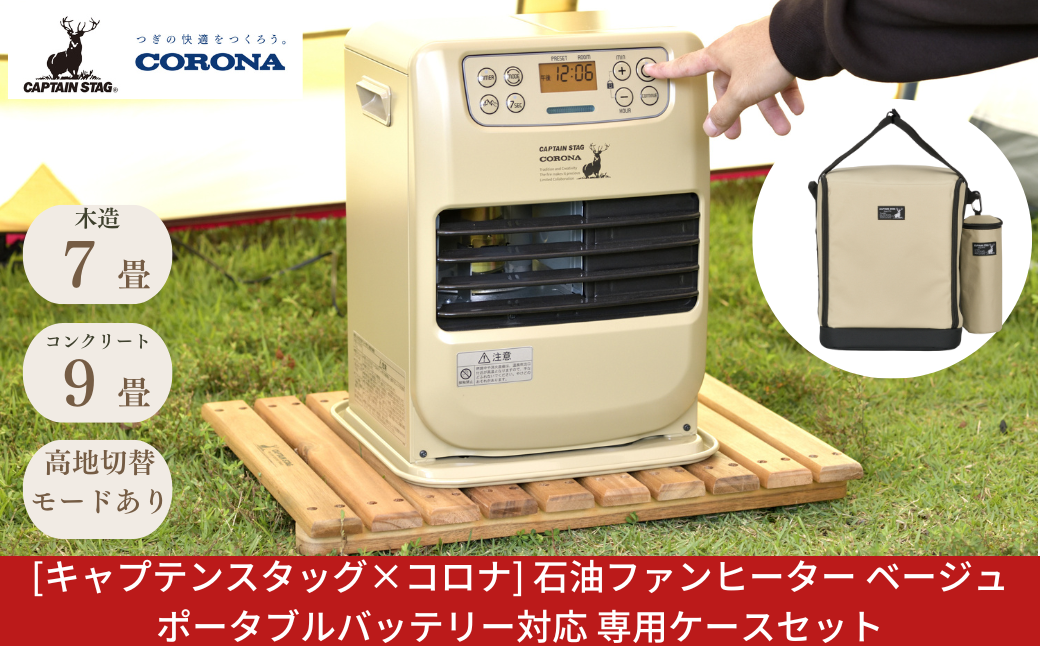 チョイスPayポイントと交換できる品 ポータブル電源対応でアウトドアでも使用可能な石油ファンヒーター [キャプテンスタッグ×コロナ] 石油ファンヒーター ベージュ 専用収納ケース付きセット 7~9畳用 ポータブルバッテリー対応 ポータブル電源対応 アウトドア用品 キャンプ用品 暖房 屋外使用 灯油ストーブ FH-CP25CS 【108S005】