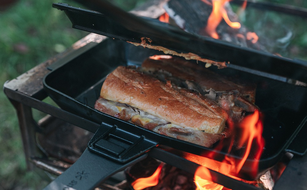 スキレットで分厚いステーキやパエリアを作ったり、食パンを2枚並べてホットサンドを焼くことも可能。