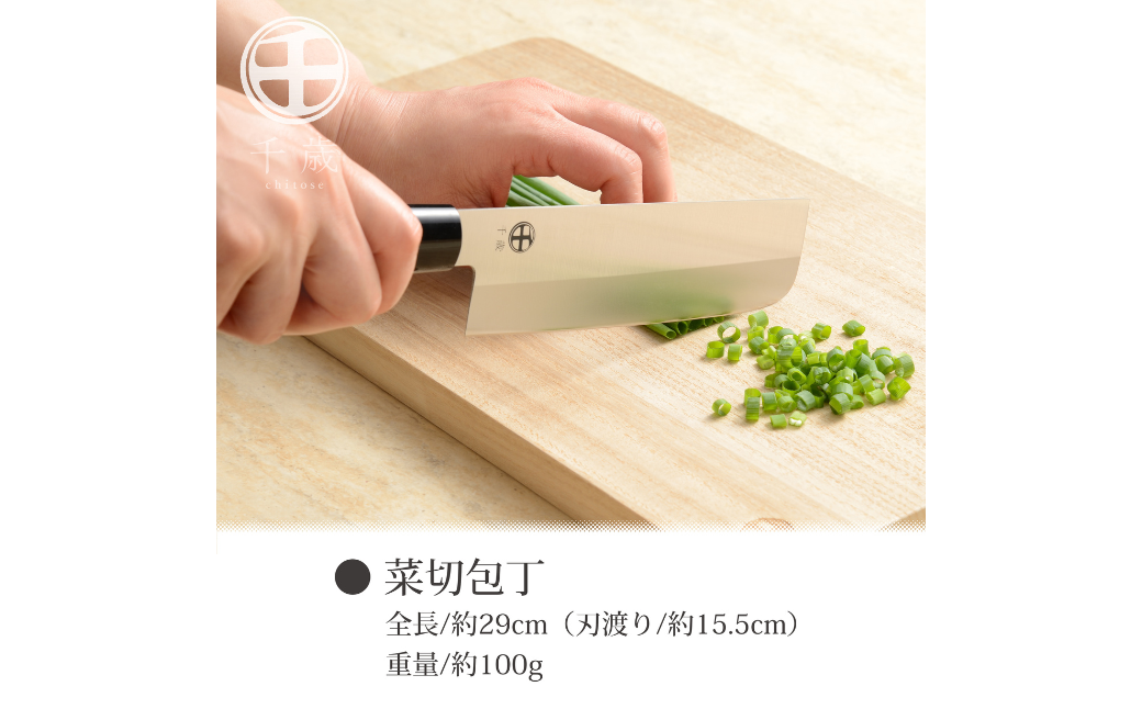 | 容量 | 【サイズ】 万能包丁/約5×29×2.2cm、全長約29cm(刃渡り約15.5cm) 菜切包丁/約5×29×2.2cm、全長約29cm(刃渡り約15.5cm) 【カラー】 刃/シルバー(ステンレス)、柄/ベージュ(木目) 【重量】 万能包丁/約94g、菜切包丁/約100g 【材質】 本体/モリブデンバナジウム鋼、柄/天然木 |