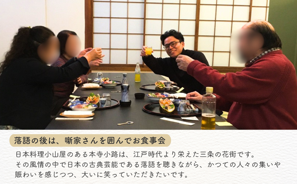 落語の後は、噺家さんを囲んでお酒とお料理をお召し上がり、三条の夜をお楽しみいただきたいです。