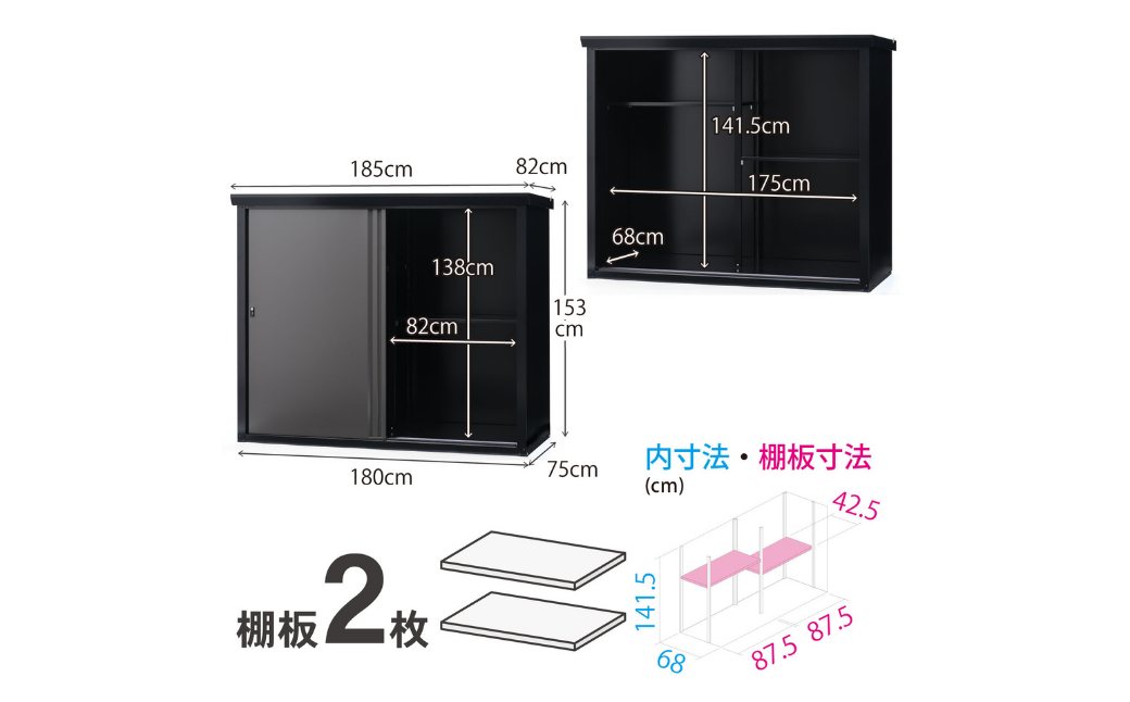| 容量 | ●サイズ:82×185×153cm ●重 量:74.5kg ●材 質:スチール(焼付塗装) ●カラー:ブラック/アッシュグレー ●付属品:棚板2枚・鍵・アンカープレート ●その他:組立式 |