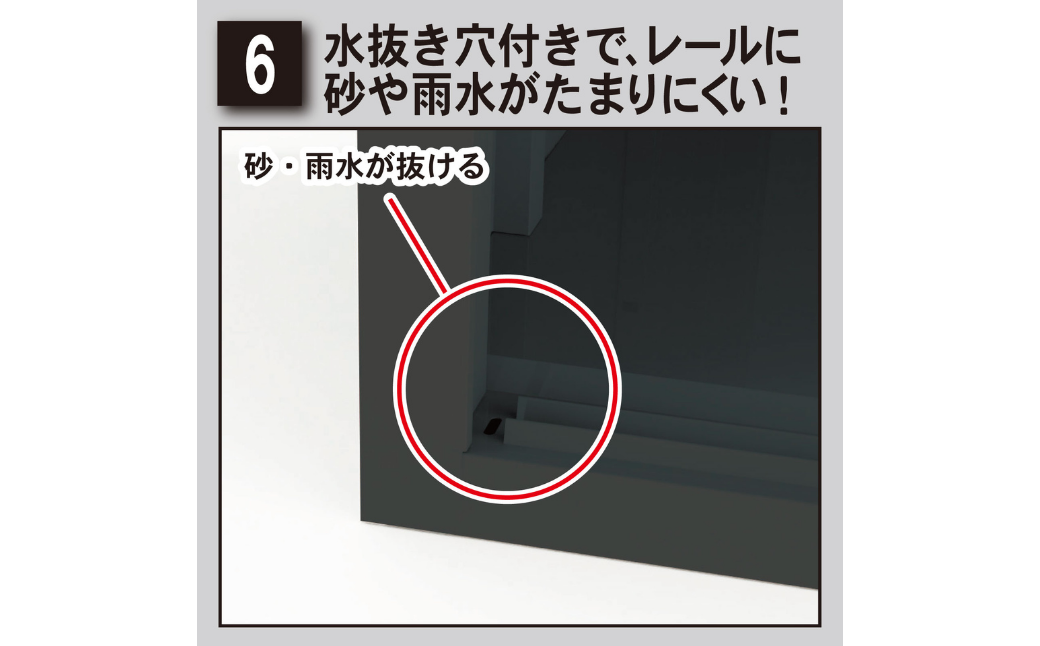 水抜き穴付きでレールに砂や雨水がたまりにくい。