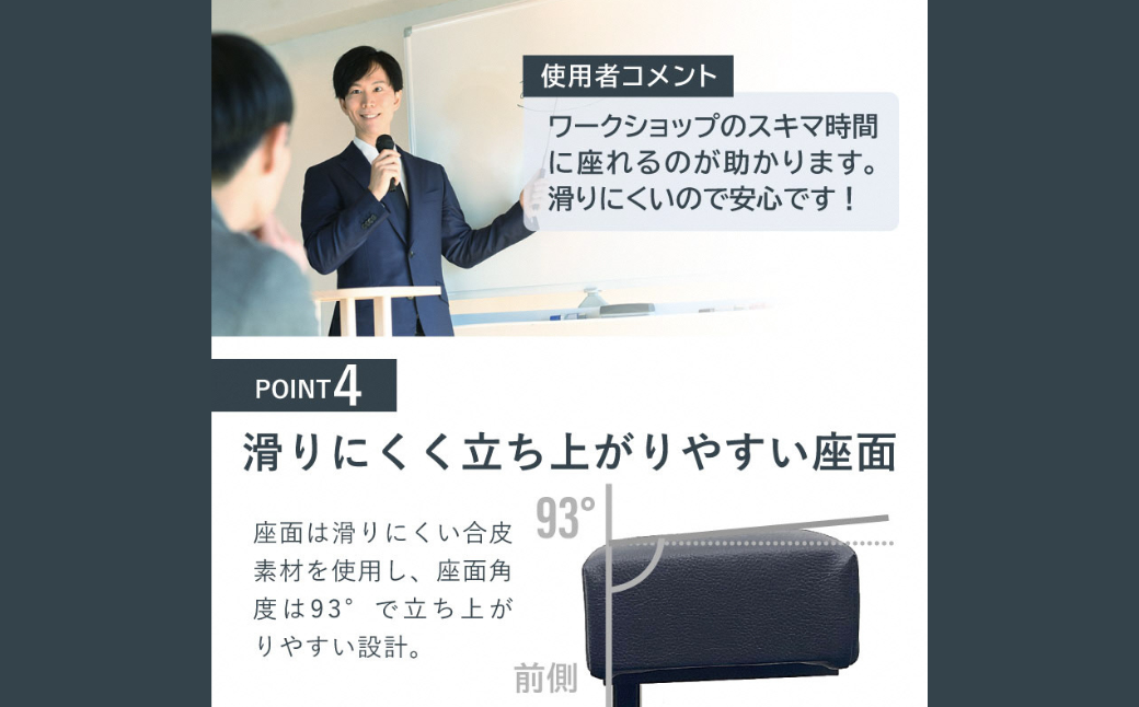 ●長時間の脚負担を軽減、”立ちながら座る"ちょい腰かけチェア。