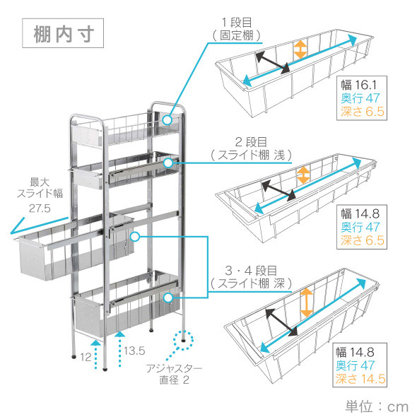 | 容量 | [サイズ]約幅21×奥行50.5×高さ103cm [重 量]約5.4kg [材 質]フレーム・カゴ/スチール(クロムメッキ)、棚板/18-0ステンレス [耐荷重]棚/1段あたり4kg [付属品]アジャスター×4個 |