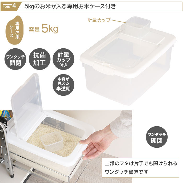 | 容量 | [サイズ]約幅28×奥行42(最大スライド時68cm)×高さ45cm 有効内寸:引出し/約幅22.5×奥行38.9×深さ4cm スライド幅:お米ケース収納部/約26cm、引出し/約23.5cm [重 量]約4.6kg [材 質]本体/スチール(クロムメッキ)・引出し/18-0ステンレス・お米ケース/ポリプロピレン [耐荷重]お米ケース収納部/5kg、引出し/5kg [付属品]お米ケース(軽量カップ付)×1個・転倒防止金具×1個 |
