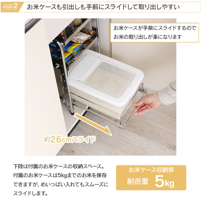 米びつも約26cm手前にスライドするのでお米の取り出し残量確認もできます。