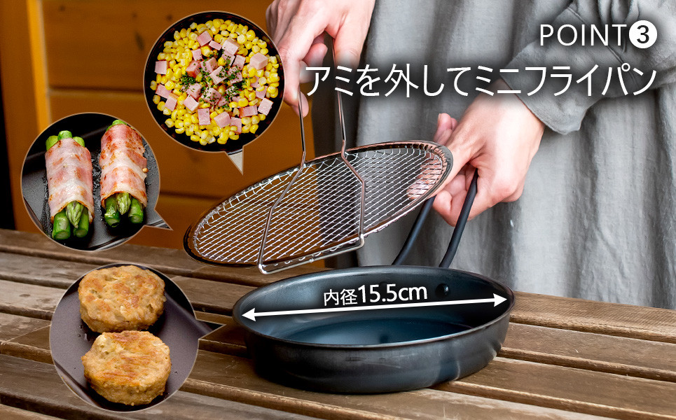 ※火にかけるとフライパンや網の取っ手が大変熱くなりますので、必ずミトンを着けてご使用ください。