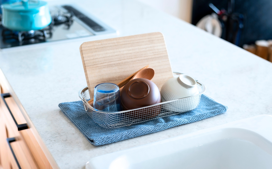シンク周りがすっきり! 片付けられるコンパクトな水切りかご。