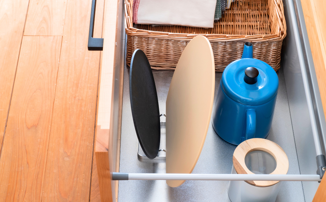幅約30cm、厚さ約1.5cmまでのまな板を2枚収納可能。