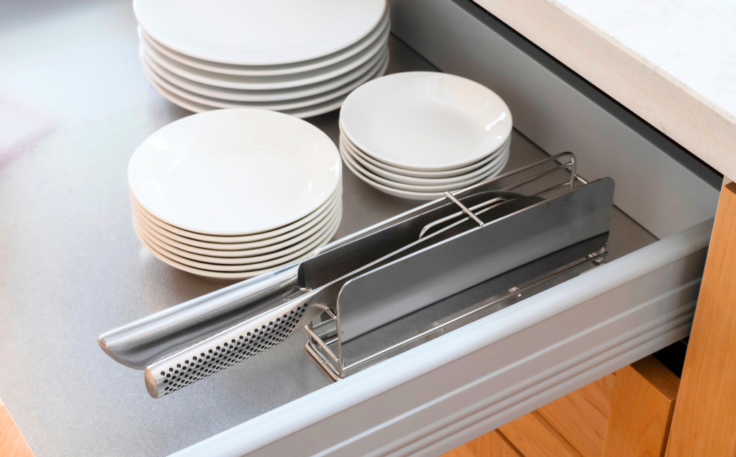 包丁2本を収納でき、高さ約8cmとコンパクトなので食器棚や引き出しにそのまま収納できます。