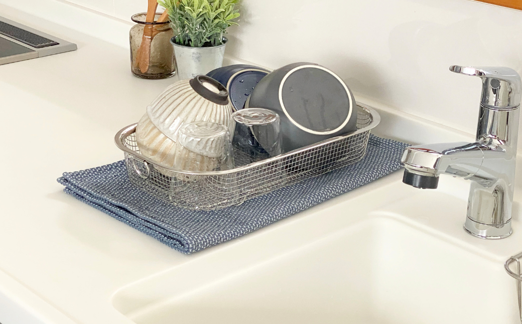 シンク周りがすっきり! 片付けられるコンパクトな水切りかご。
