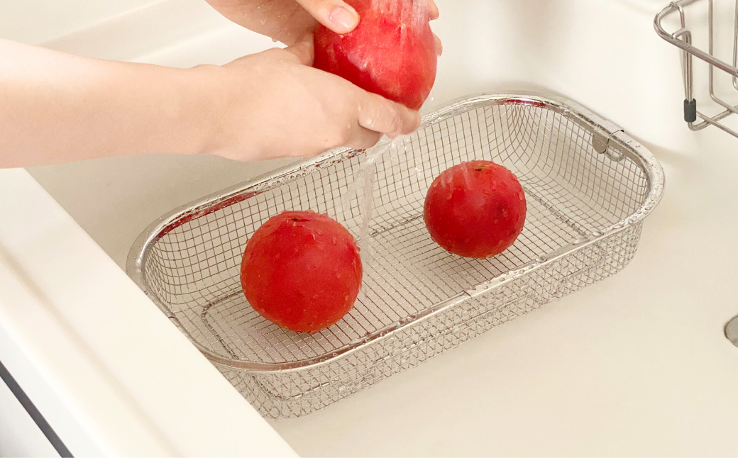 カゴの目が細かいので、ちょっとしたお皿や小物などはもちろん、野菜などの水切りザルとしても便利。
