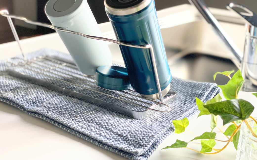 置き場所に困る水筒などの水切りに。乾きにくい水筒を斜めに立てて乾かせます。